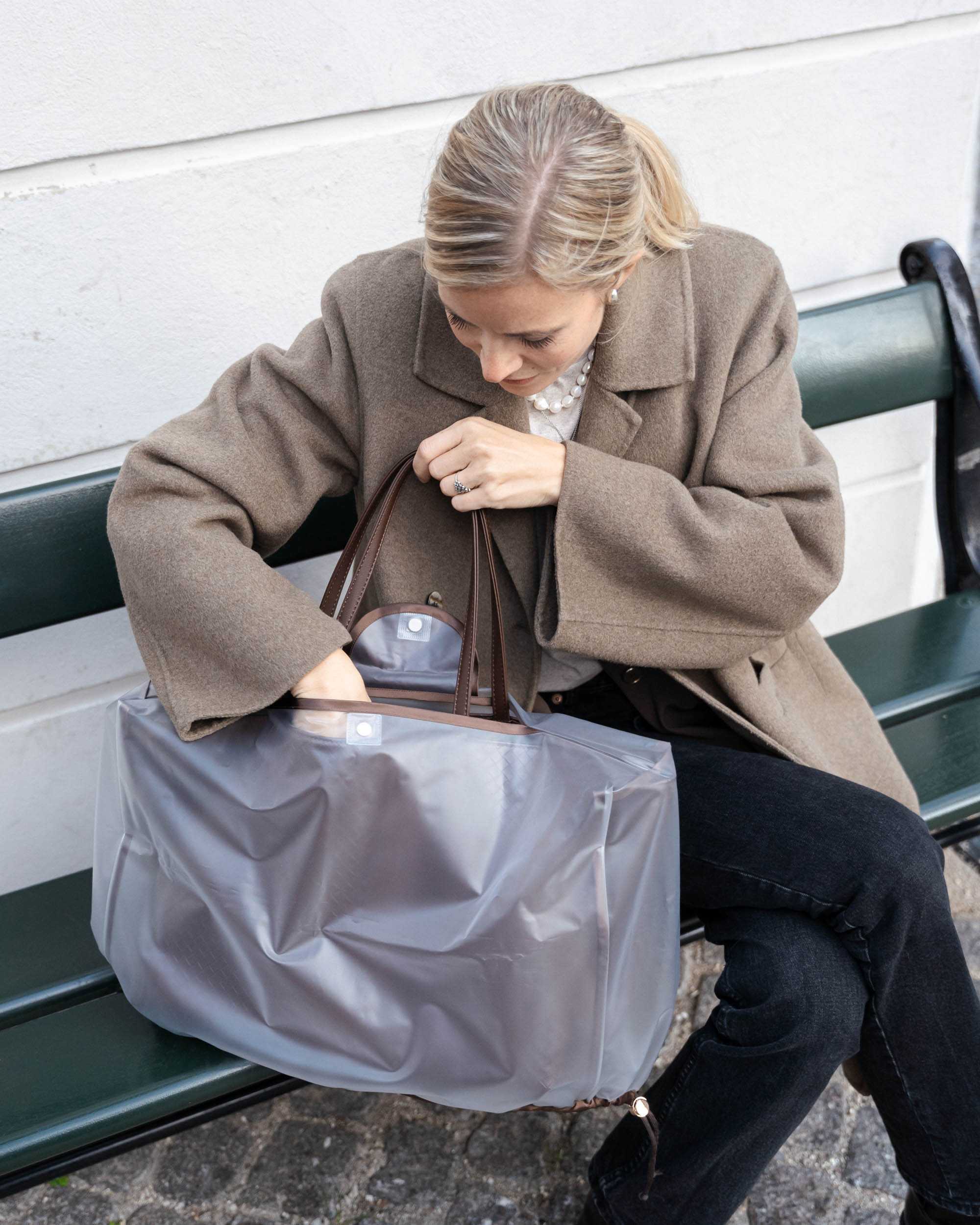 Our transparent ReRAIN Cover fits most types of tote bags, shoppers, and work bags. Made from 100% thermoplastic polyurethane and finished with elegant satin edges. The clear material ensures that your bag remains visible through the cover, allowing you to maintain a stylish look. Please note, the product is not resistant to sharp edges, machine washing, tumble drying, or ironing.
